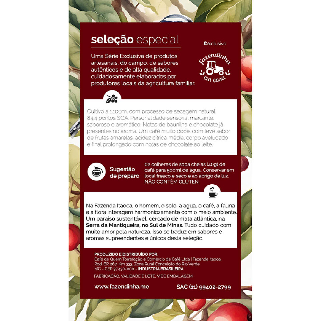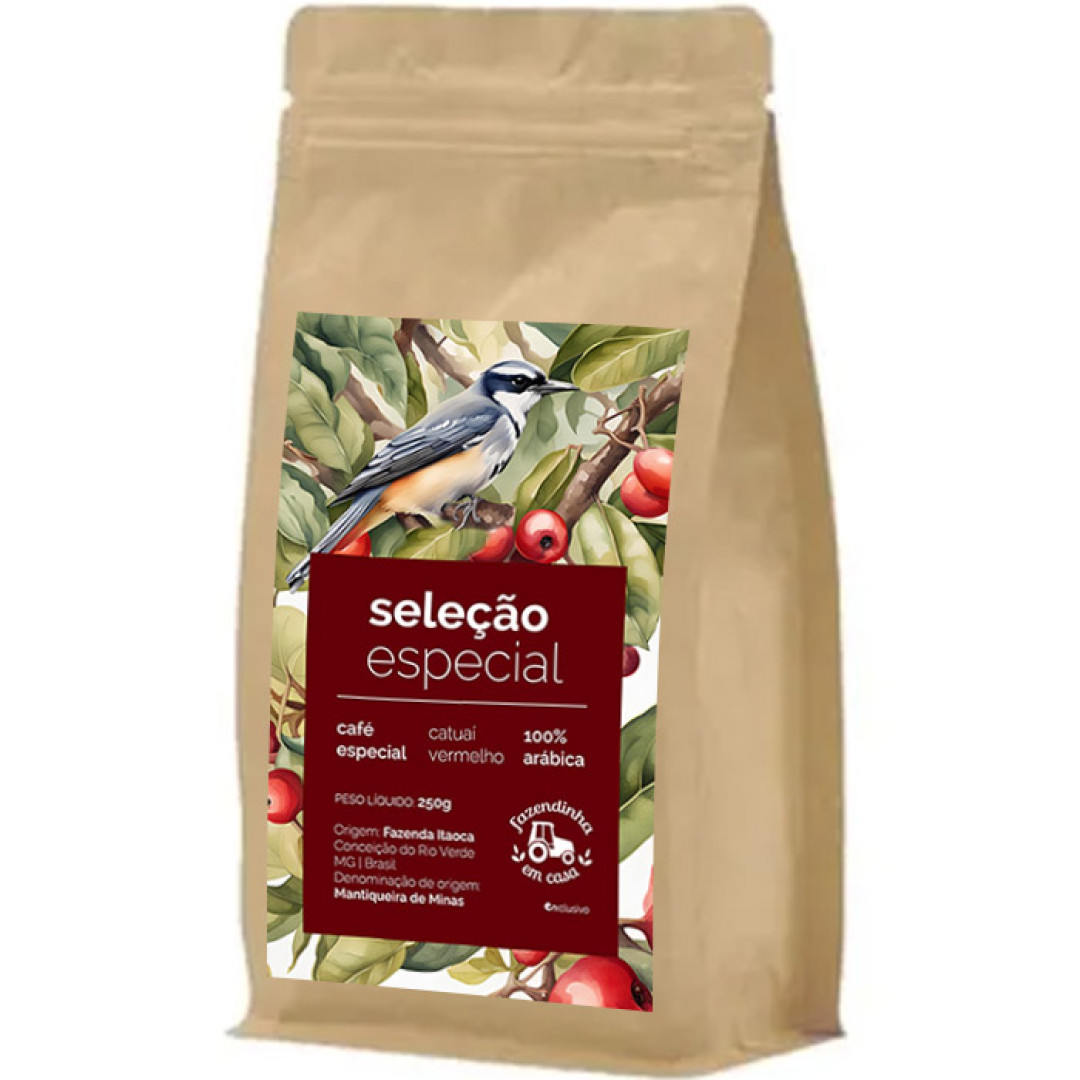 O Café Seleção Especial faz parte de uma Série Exclusiva Fazendinha em Casa de produtos artesanais, do campo, de sabores autênticos e alta qualidade, cuidadosamente elaborados por produtores locais da agricultura familiar. Café Especial catuaí vermelho 100 arábica.